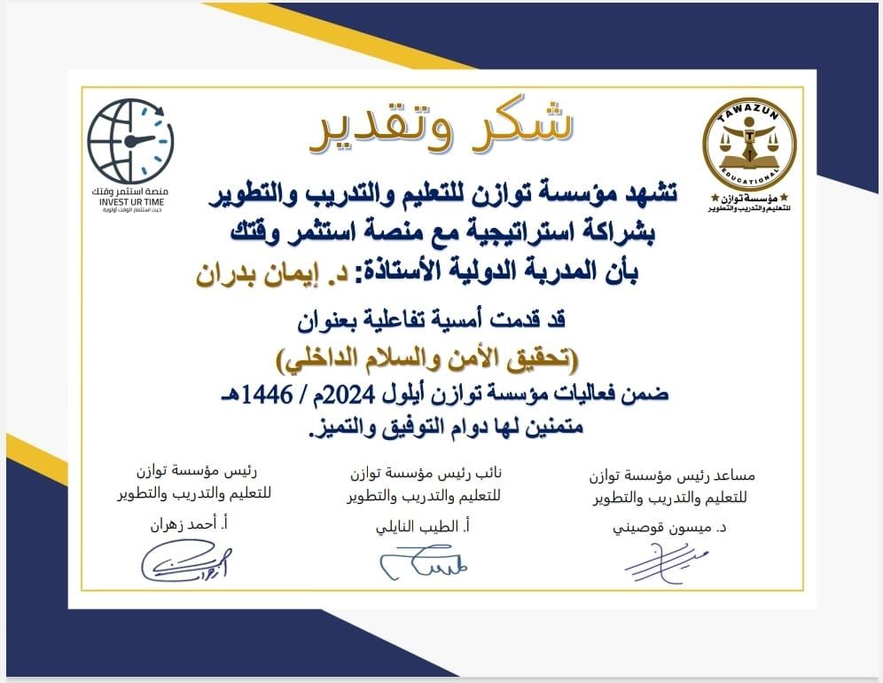 ضمن فعاليات مؤسسة “توازن للتدريب والتطوير”، قدمت د. إيمان بدران ورشة تدريبية متميزة بعنوان “الأمن الفكري والسلام الداخلي” حضرها عدد كبير من المهتمين والمتخصصين في المجال. أقيمت الورشة في إطار برنامج المؤسسة لتعزيز الوعي المجتمعي وتطوير المهارات الشخصية والذهنية للأفراد.